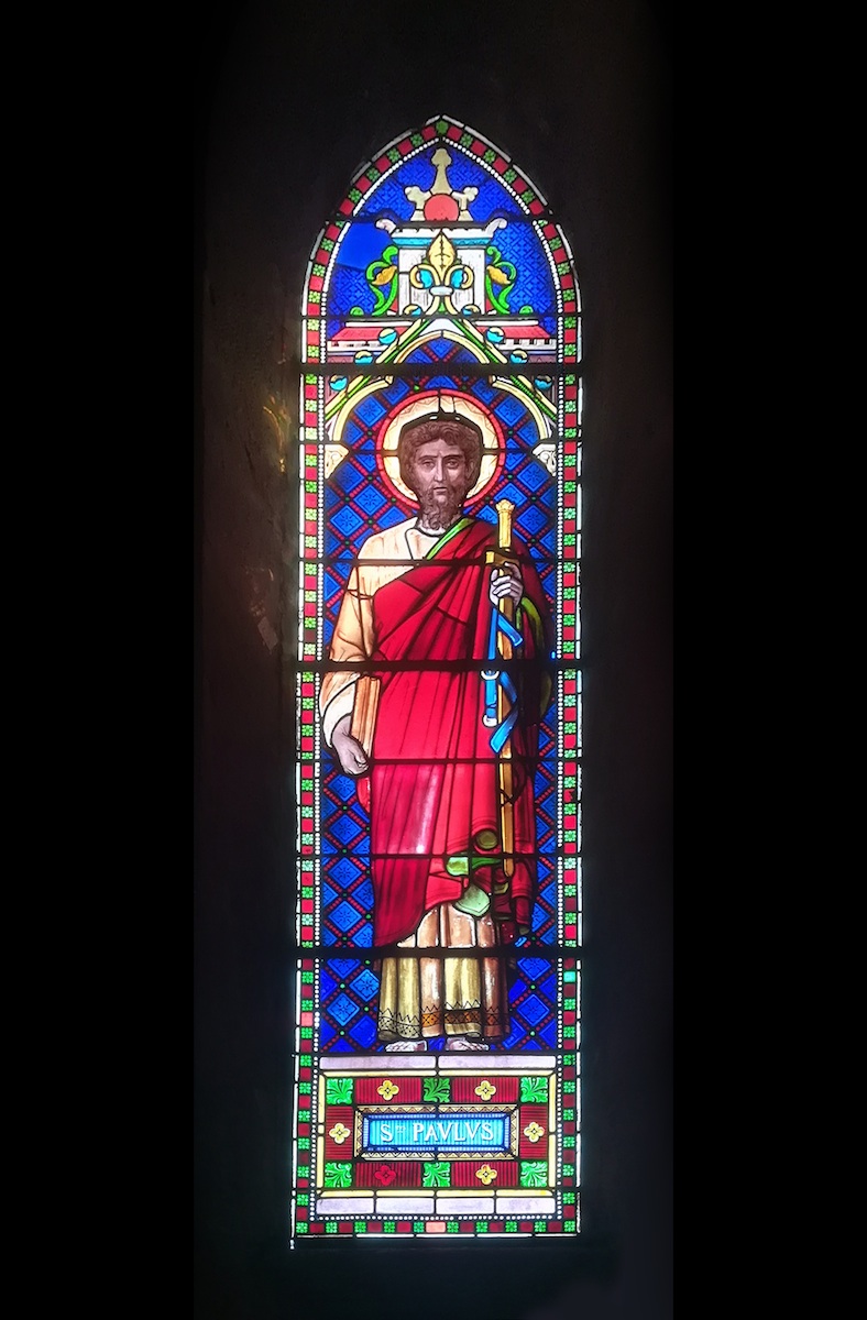 Restauration de vitrail - Visage de Saint Paul : peinture sur verre de Raymond Dumoux