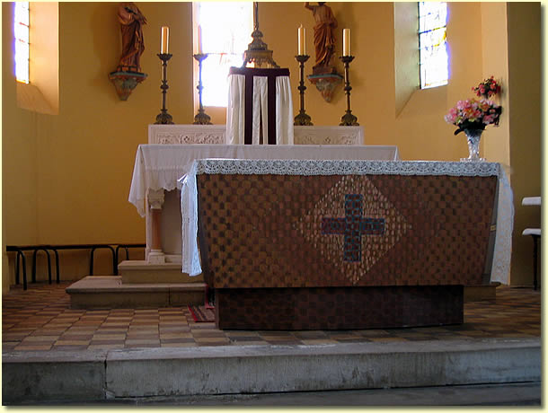 | Pour cette même église de Saint-Eusèbe, un autel peint fut réalisé par Raymond Dumoux. Le décor peint est dans le prolongement des toiles abstraites géométriques. | |||